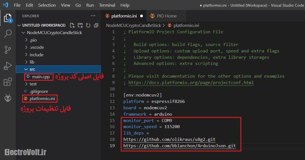 بعد ایجاد پروژه ؛ به سادگی میتوانید پروژه ایجاد شده را در سمت چپ نرم افزار VS Code مشاهده کنید که شامل فایل تنظیمات پروژه ( platformio.ini ) و فایل اصلی کدنویسی پروژه ( Main.cpp ) می باشد.