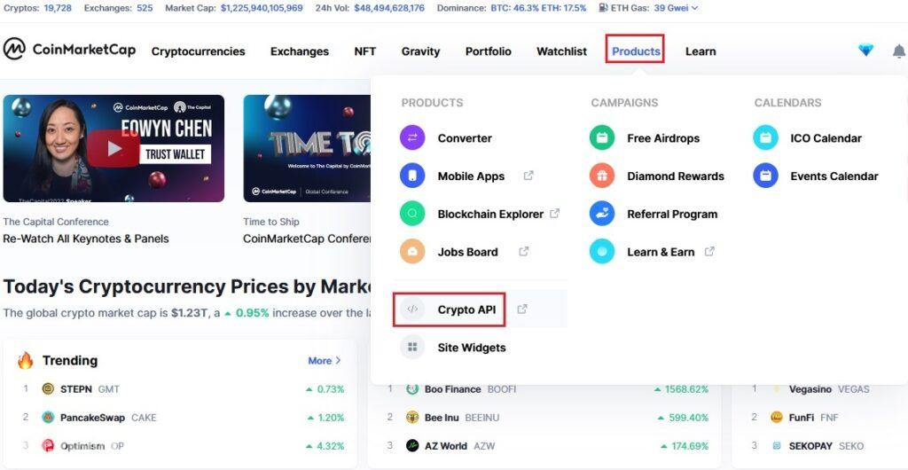 برای اینکه از آخرین قیمت بیت کوین و سایر رمز ارز ها مطلع شوید به سایت CoinMarketCap.com بروید. این سایت یکی از مرجع های رسمی قیمت و اطلاعات مفید دیگر دنیای رمز ارزها می باشد. اما برای کرفتن API که بتوان با اتصال NodeMcu به این سایت آخرین قیمت بیت کوین را دریافت کرد نیاز است ابتدا در بخش Developers این سایت عضو شوید. برای این منظور به صفحه اصلی سایت بروید و مطابق شکل زیر از منوی Product روی API کلیک کنید.